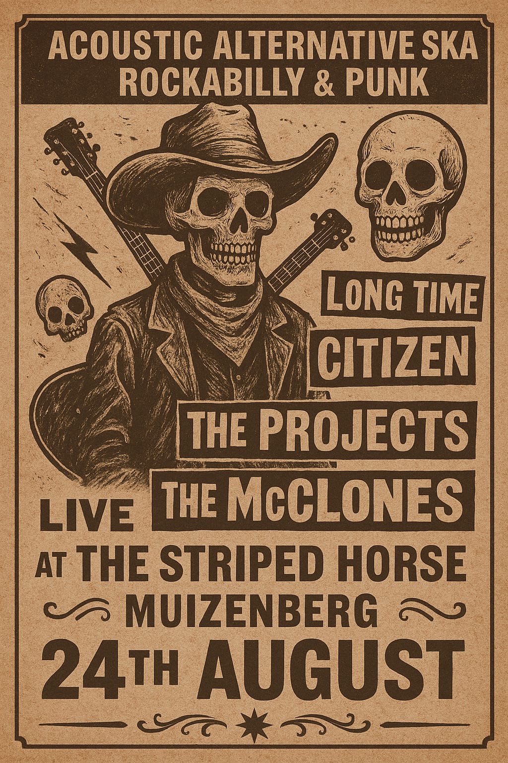 The Striped Horse, Muizenberg 12 York Rd, Muizenberg, Cape Town, 7950, Cape TownOld guys reunite! For an afternoon of acoustic, ska, rockabilly & punk. More details to follow. Free entrance.